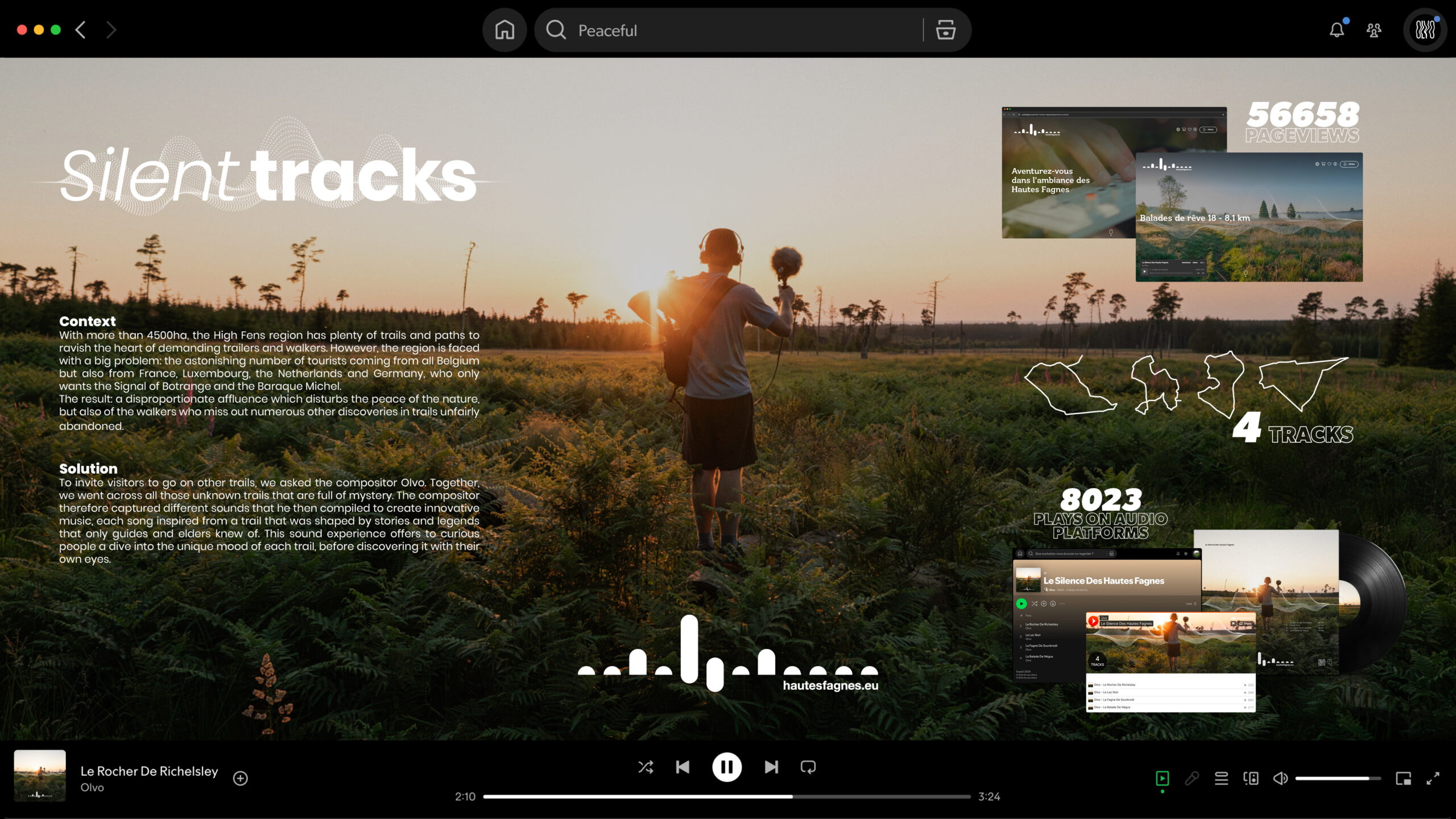 To invite visitors to go on other trails, we asked the compositor Olvo. Together, we went across all those unknown trails that are full of mystery. The compositor therefore captured different sounds that he then compiled to create innovative music, each song inspired from a trail that was shaped by stories and legends that only guides and elders knew of. This sound experience offers to curious people a dive into the unique mood of each trail, before discovering it with their own eyes.